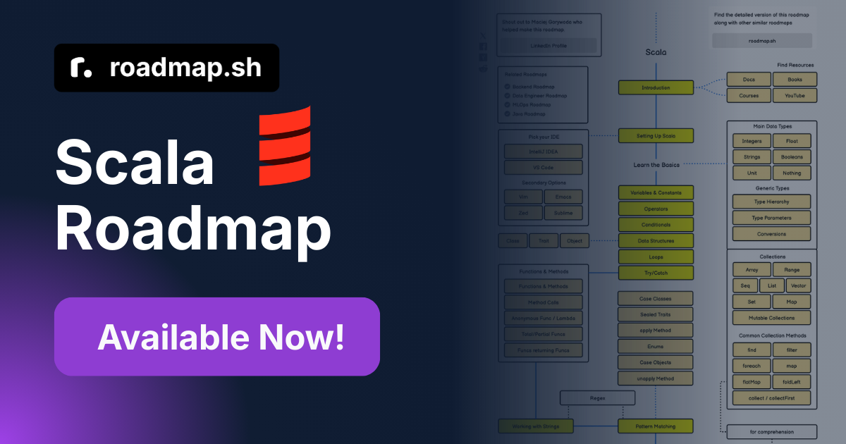 The Scala Roadmap is now officially published at roadmap.sh/scala. It is a learning roadmap designed to help beginners decide what to learn and in what order, and to discover relevant resources. It is one of the largest roadmaps on roadmap.sh, featuring over 150 nodes, each accompanied by descriptions and links to articles, videos, and code examples.